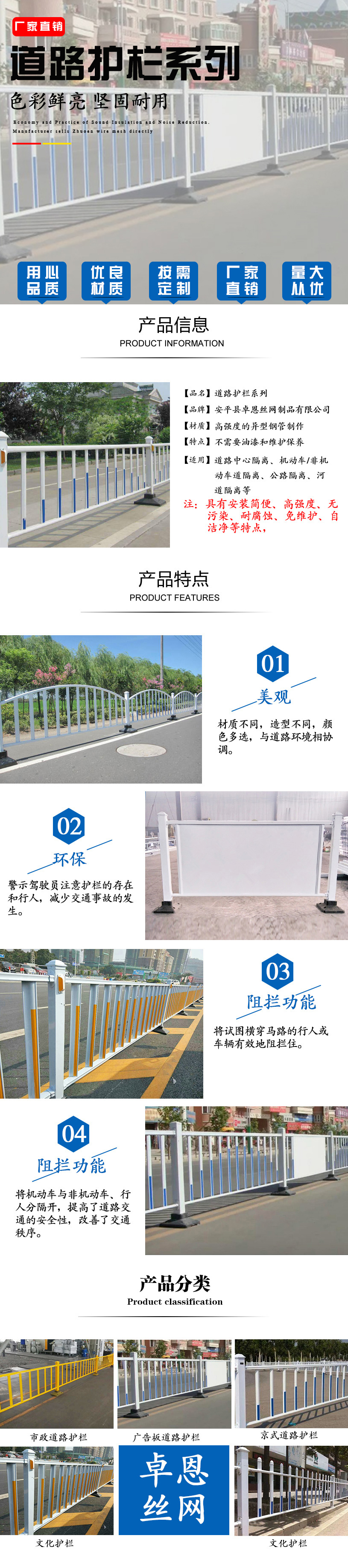 3、市政护栏是目前受欢迎的道路隔离护栏之一。主要用于场区隔离带,市政工程隔离带,园林护栏。市政建设中的公园、草坪、动物园、池湖、道路、及住宅区的隔离与防护;宾馆、酒店、超市、娱乐场所的防护与装饰。
